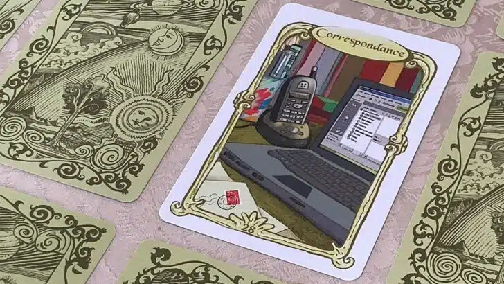 La carte de la Correspondance symbolise la communication, les échanges, et la transmission de messages. Elle représente les paroles écrites, les nouvelles reçues ou envoyées, mais aussi les dialogues du cœur et de l’esprit. C’est une carte de lien, de connexion, d’ouverture vers l’autre.