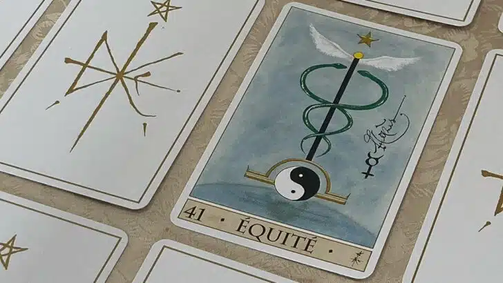 L’Équité installe un climat de justice, d’équilibre et de discernement. Elle indique que la situation demande une vision claire et un jugement impartial. Il s’agit d’un moment où l’on cherche à rétablir l’harmonie, à comprendre les forces en présence et à poser des bases solides. Cette carte peut signaler la nécessité d’agir avec transparence ou d’accepter un verdict extérieur. L’atmosphère générale est marquée par la recherche de justesse, autant envers soi-même qu’envers les autres, et par une volonté d’avancer sans excès ni précipitation.